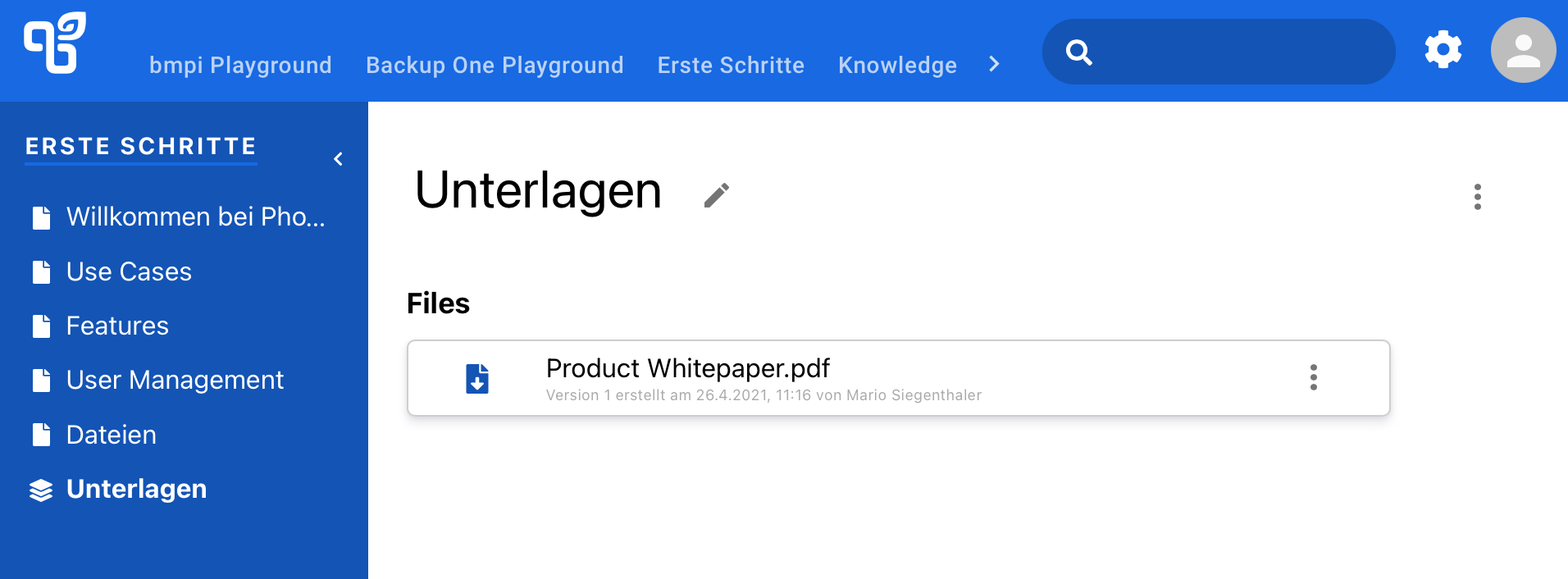 In anderen Wiki-Systemen existieren Dateien oft nur als Anhänge zu Seiten. Während dies für viele Dateien wie eingebettete Bilder etc. sinnvoll ist, wird es unserer Meinung nach nicht der Bedeutung von Dokumentationen gerecht, die als PDFs oder Office-Dokumente bereitgestellt werden können.